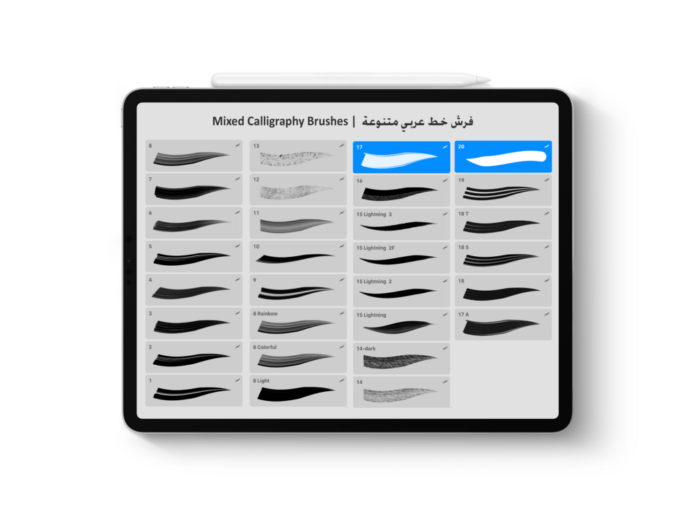 - Different Styles of Arabic Calligraphy Brushes for Procreate, including Tomar , Lightining/Flame, Crayon, Rainbow, Chalk and Paining Brushes.